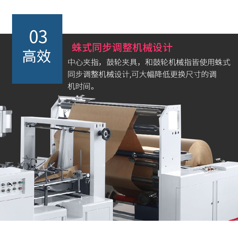 可調式卷簡方底紙袋機,它具有速度央、生產效益高、調節范圍大的優點。此設備是將原色或印刷好的卷筒紙由本機一次完成側邊上膠,折疊成微、紙筒切斷、底部涂膠、袋底成型、出袋,整機由計算機中央控制系統控制、觸摸屏顯示,伺服電機控制紙袋長短,可生產多種規格紙袋,是統袋生產加工的首選設備。
